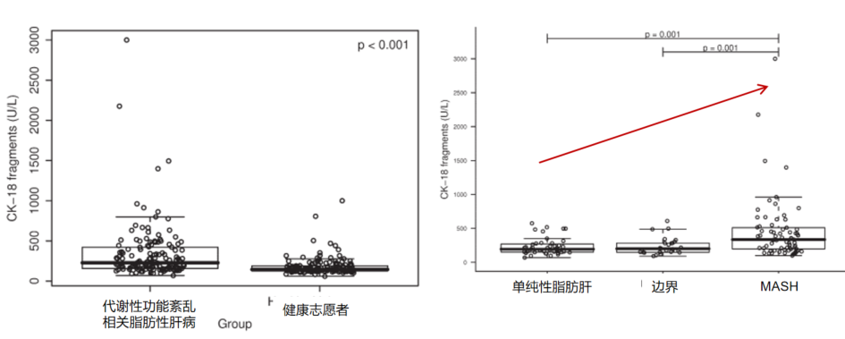 與健康人相比,MASLD患者血清CK18含量顯著升高;與單純性脂肪變性和邊緣診斷患者相比,MASH患者血清CK18含量顯著升高。MASH患者血液中CK-18片段顯著增加,CK18是MASH的獨立預測因子[1]。