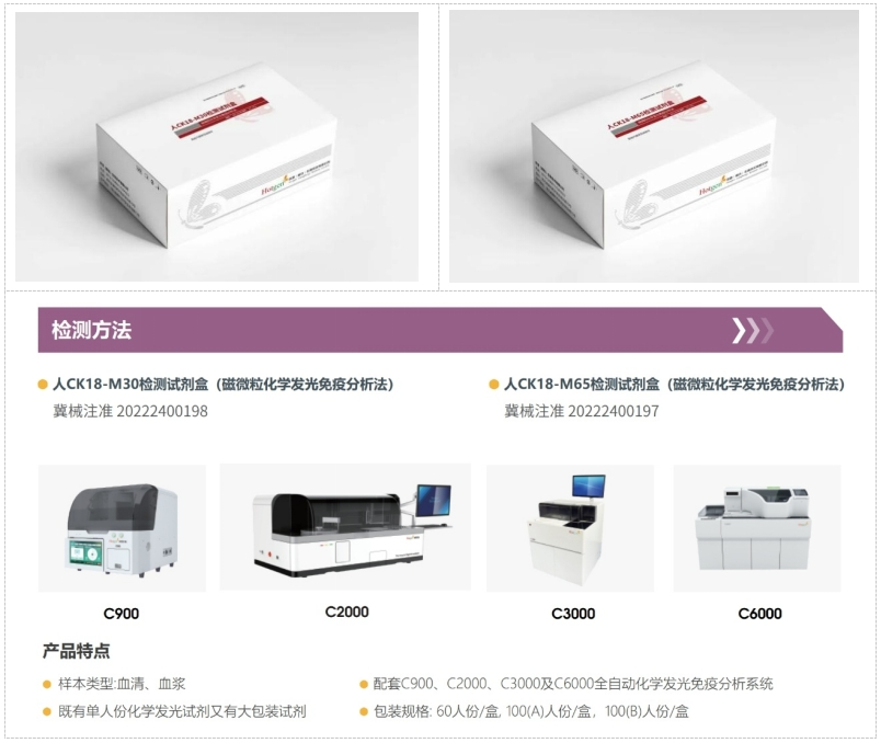 熱景生物新品-CK18(化學發光法國內第一證)采用先進的化學發光免疫分析技術,具備極高的靈敏度和特異性,能夠準確檢測血清中的CK18-M30和CK18-M65水平。